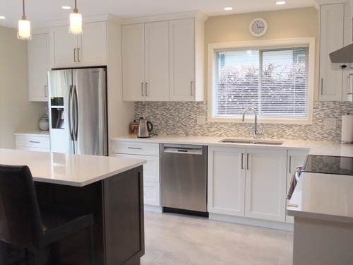 A bathroom renovation included a custom vanity with stone counters and marble backsplash. The light and neutral materials work together to create a calm space. Featuring a walnut island in a custom stained finish. A much needed improvement on a u-shaped kitchen to allow for large family gatherings.